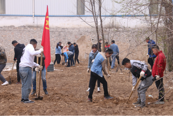 在園區(qū)內(nèi),大家興致勃勃,干勁十足,有的揮鍬挖坑、有的搬運樹苗、有的扶苗培土、有的提水澆灌,經(jīng)過3個小時的忙碌,100棵松柏昂然挺立,呈現(xiàn)出一派生機勃勃的景象。
