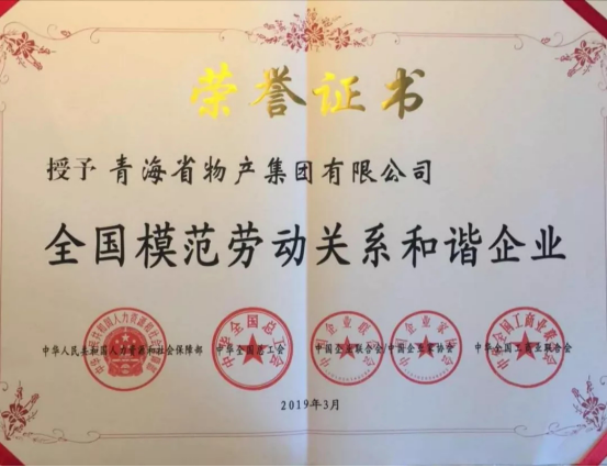 由青海省人力資源和社會保障廳、青海省總工會、青海省企業(yè)聯(lián)合會/企業(yè)家協(xié)會、青海省工商業(yè)聯(lián)合會共同推薦申報,青海省物產(chǎn)集團(tuán)有限公司、青?;ブ囡乒煞萦邢薰尽⒄铰窐蚪ㄔO(shè)股份有限公司榮獲全國模范勞動關(guān)系和諧企業(yè)光榮稱號,西寧經(jīng)濟(jì)技術(shù)開發(fā)區(qū)東川工業(yè)園區(qū)榮獲全國模范勞動關(guān)系和諧工業(yè)園區(qū)光榮稱號,受到了國家人力資源和社會保障部、中華全國總工會、中國企聯(lián)、全國工商聯(lián)的隆重表彰。